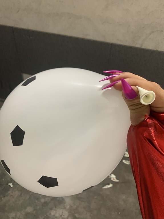 ENGLISH: Hanna after inflating 18 balloons with her mouth, she is ready to pop all the balloons for the first time with 2 cigarettes and her beautiful stiletto nails. No balloon has a chance in front of her cigarette!